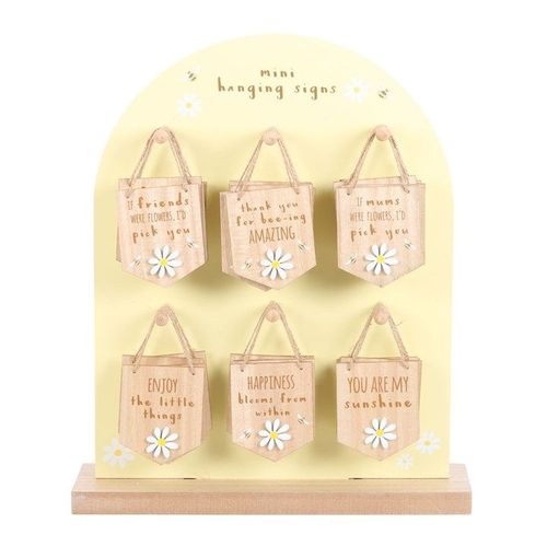 Upgrade your Mother's Day and embrace the new season with this lovely set of 24 mini hanging signs. Every wooden sign displays a touching message for mothers, friends, and others, such as "You bring sunshine into my life" and "I am grateful for your amazingness". Adorned with 3D daisy details and a jute rope for hanging. Available as a set of 24 signs, evenly assorted, on a complementary MDF display.