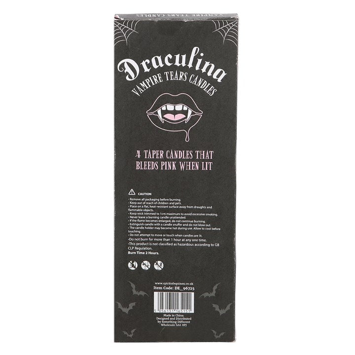 Illuminate any space with this set of four unscented pink taper candles. When lit, they showcase stunning "vampire tears" drippings, making them a striking addition to gothic-themed dinners or as a one-of-a-kind present. Each candle has an estimated burn time of 2 hours.